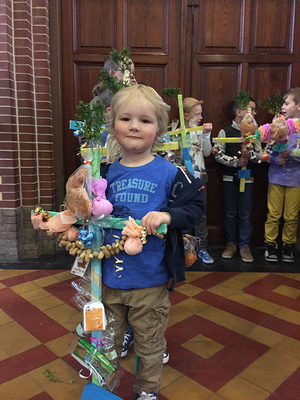 Deze en nog veel meer vragen kan je je als volwassene stellen als je (klein)kind(eren) gevraagd wordt om het aangeleverde kruis van een palmpaasstok ‘aan te kleden’ met van alles en nog wat. Natuurlijk weten we dat geel en groen crêpepapier niets te maken heeft met het naderende kampioenschap van ADO Den Haag maar met de lente, het jonge leven. Maar hoe zit het met al die andere dingen die we gebruiken bij het ‘aankleden’ van een kale palmpaasstok? Klik hier de link maar aan met informatie over de symboliek van alles wat aan een palmpaasstok gehangen kan worden. Misschien ook handig voor de volwassenen die vrijdagavond 27 maart in ‘de kleine JOANNES’ aan de slag gaan met het ‘aankleden’ van een palmpaasstok. En alles voor die ander die een steuntje in de rug kan gebruiken. Doe dus mee vanavond, het is nog verrekte gezellig ook!