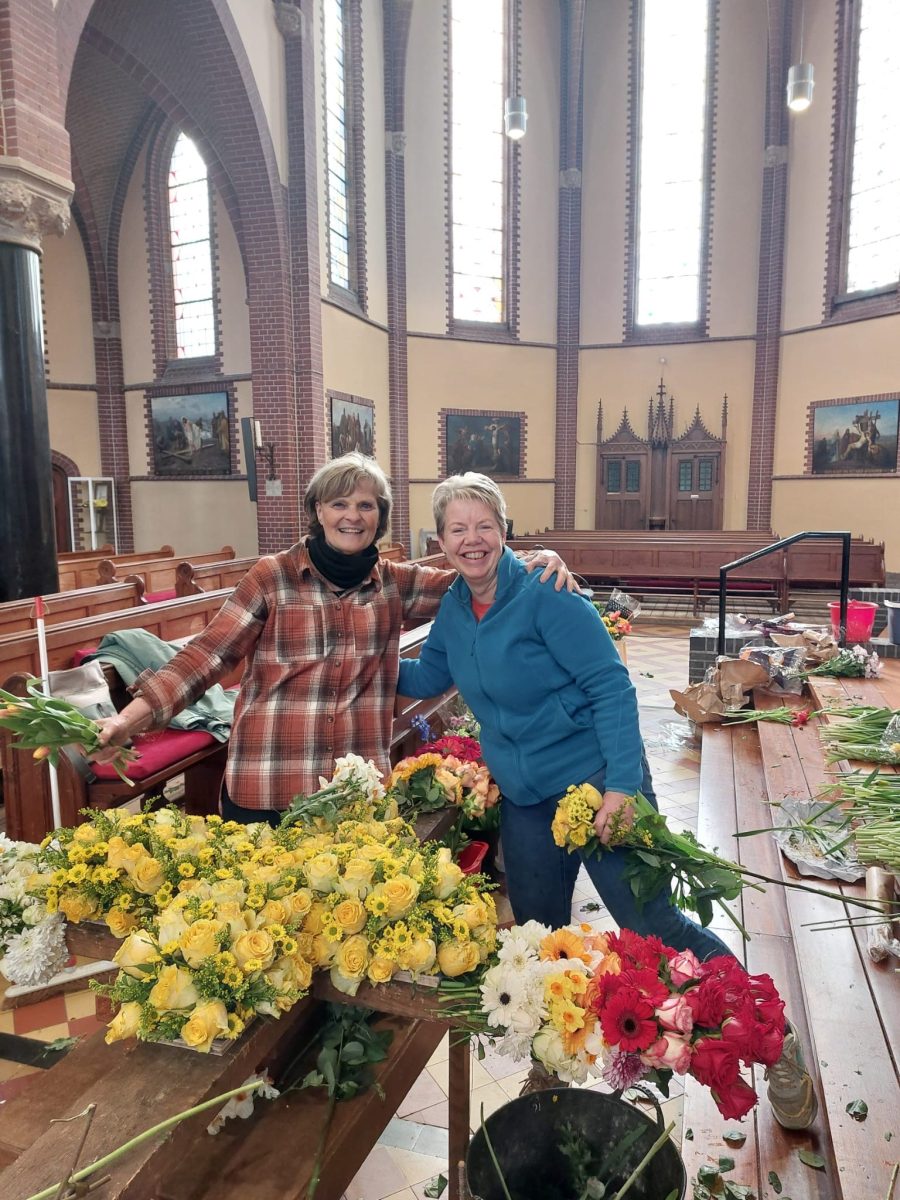 Met het brengen van de meest uiteenlopende en kleurrijke bloemen bij de kruisweg en de viering van Goede Vrijdag in de Katwijkse parochiekernkerk van de H. Joannes de Doper lag er weer een mooie uitdaging op Stille Zaterdag voor de vrijwilligers Nel Hesselberth en Helma Boskamp. Ze gingen nu voor het zesde jaar met de meegebrachte bloemen het grote ruwhouten kruis aankleden. Hesselberth: ,,Vanmorgen om 6.00 uur begonnen en in de paaswake deze zaterdagavond 4 april staat het ‘gebloemd’ vol in het (kunst)licht als passend bloemrijk teken dat Jezus is opgestaan.” Boskamp: ,,Opvallend was ook dit jaar weer het geringe aantal narcissen waar onze voorganger Wil van Rijn vroeger bijna een 80% van deze gele bloemen kon benutten, maar het creatieve en kleurrijke resultaat was er ook dit jaar zeker niet minder om. Kleuren die perfect passen bij de kleuren van de bloembollenvelden in de Katwijkse regio.”