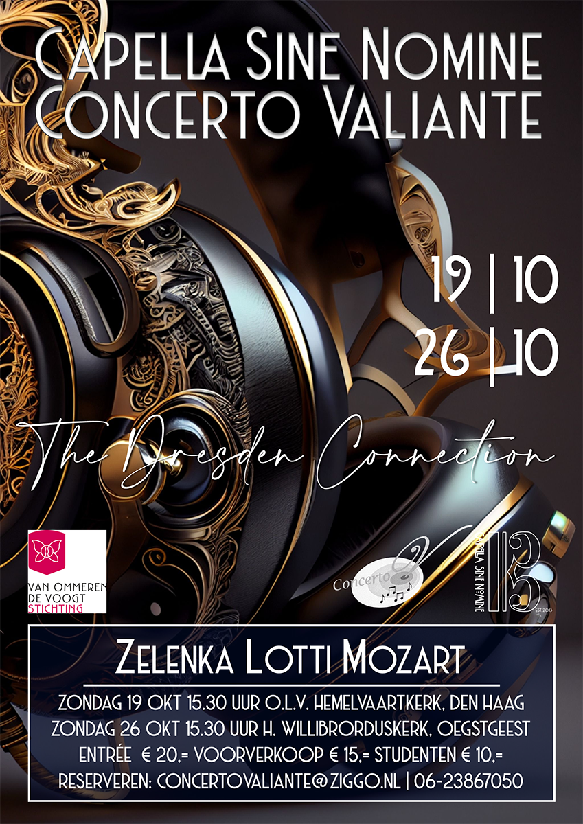 Capella Sine Nomine en het barokorkest Concerto Valiante slaan de handen op een unieke wijze ineen. Samen brengen zij het programma ‘The Dresden Connection’, met muziek van Jan Dismas Zelenka, Antonio Lotti en Wolfgang Amadeus Mozart. Wat ooit in de hofkerk van Dresden klonk, klinkt nu op zondagmiddag 26 oktober vanaf 15.30 uur in de fraaie H. Willibrordkerk in Oegstgeest. En daar kan u, kan jij, bij zijn om van te genieten met al uw zintuigen. Hoe? Kaarten aan de deur kosten € 20,- en in de voorverkoop € 15,-. Stuur dus snel een mailtje naar Concertovaliante@ziggo.nl of capellasinenomine@gmail.com of bel rap naar 06 – 23867050 om de voorverkoop te regelen. Voor de vele studenten in Leiden en wijde omgeving geldt een zeer aantrekkelijke entreeprijs van € 10,-. Had de belastingdienst vroeger al niet de slogan ‘Leuker kunnen we het niet maken, wel makkelijker’? Hier wordt het gebruikt om cultuur ook op een financieel laagdrempelige wijze bij die jongeren onder de aandacht te kunnen brengen.