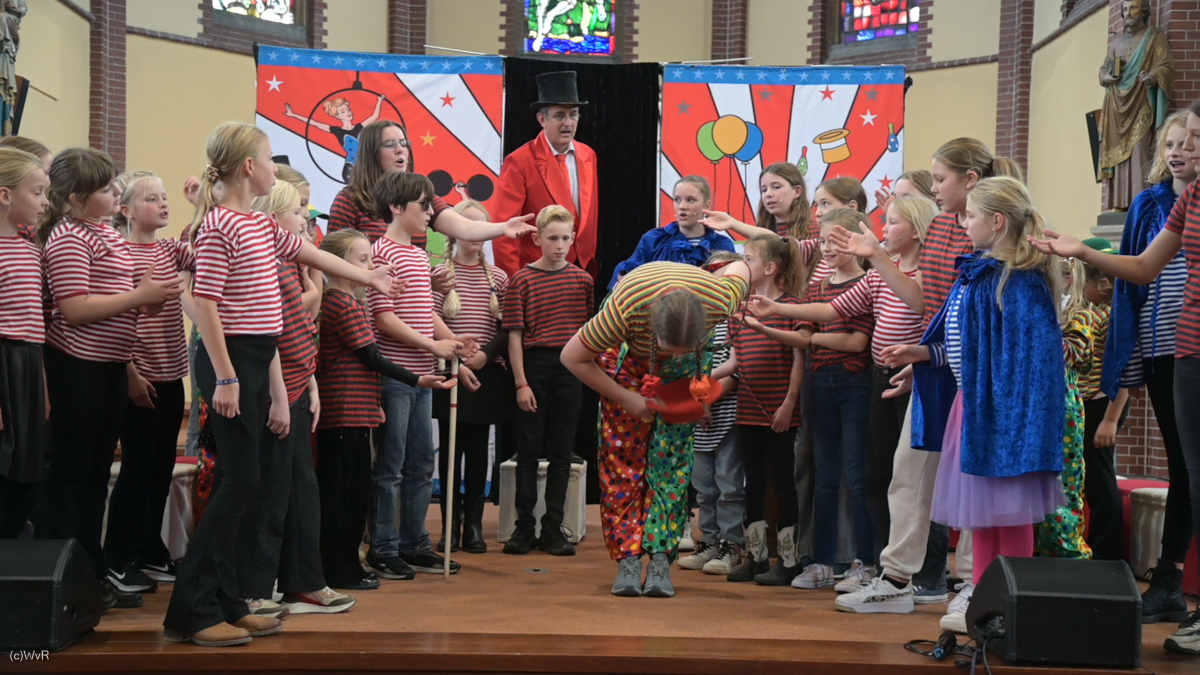 Gaat er bij u, bij jou, al een lichtje branden bij het lezen van de naam ‘Koemi’? Dat is namelijk ook de organisatie die zondag 13 oktober 2024 in ons kerkgebouw met kinderen van de gehele parochie H. Augustinus, waarvan de meesten kwamen uit De Vrolijke Noot, een mini-musical opvoerde. Na de gezinsviering die ochtend gingen de medewerkers van ‘Koemi’ met parochiële vrijwilligers enkele uren alles inoefenen. En na een heerlijk lunch en wat uurtjes spel en zang was er in de namiddag de uitvoering in onze kerk. Deze foto was, onder klaterend applaus van de trotse aanwezige (groot)ouders en andere belangstellenden, één van de laatste genomen foto’s die middag.