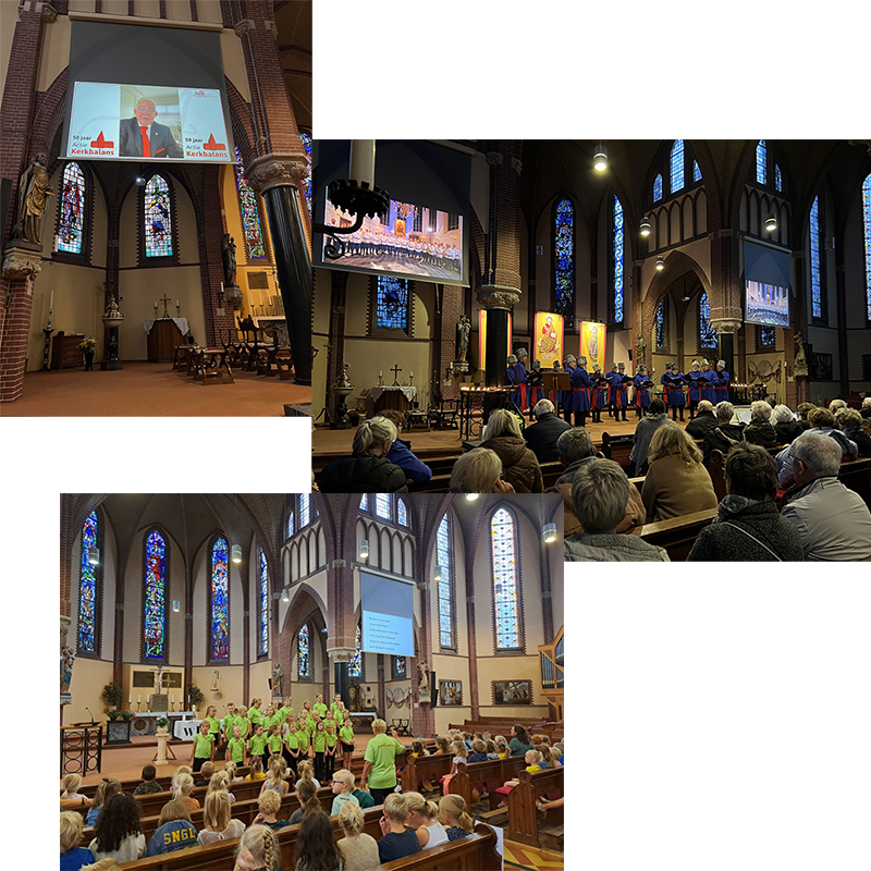 Op deze drie onderstaande verschillende momenten werden de beamerschermen benut om informatie te verstrekken aan de kerkgangers, bezoekers aan ons kerkgebouw. Dat gebeurt zeker ook voorafgaand aan de zondagviering met sheets over (afwisselend in de presentatie opgenomen); de thermometer van de lopende Actie Kerkbalans; ‘Hip helpt’ en wie er voorgaan in de viering en de muzikale medewerking verzorgen.