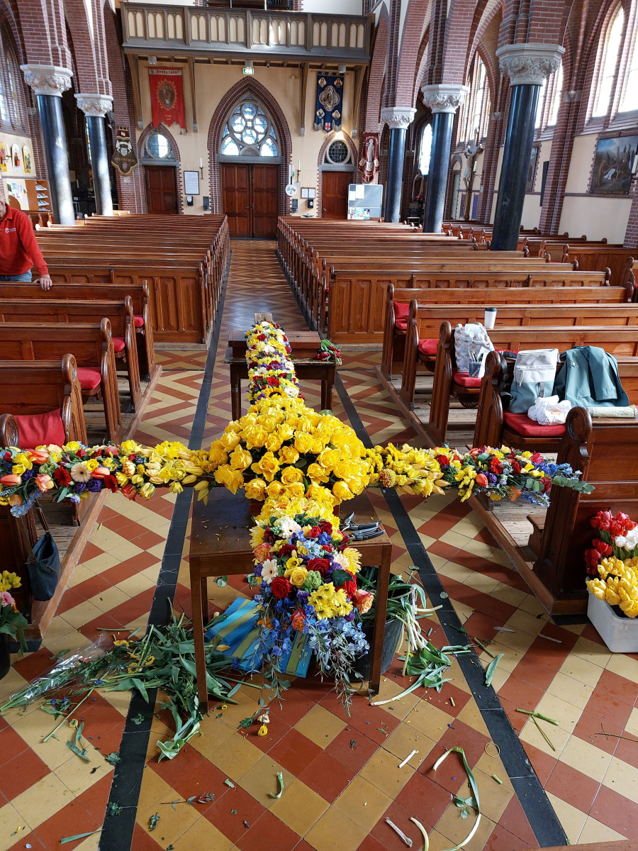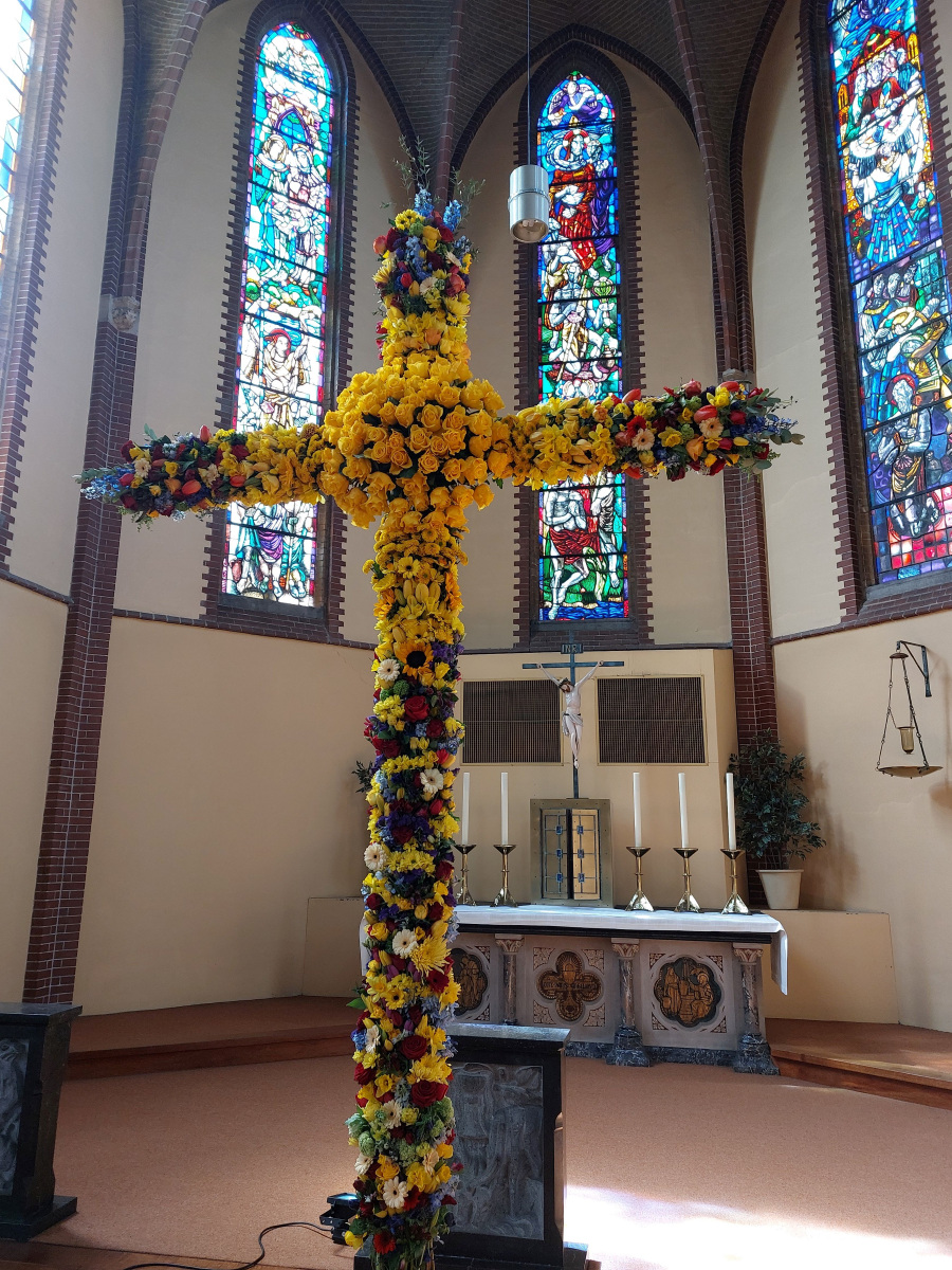 Bij de viering van Goede Vrijdag later die dag werd het grote ruwhouten kruis onder indrukwekkend tromgeroffel binnengedragen en voorin de kerk geplaatst. Bij die kruishulde werden ook bloemen door de kerkgangers neergelegd terwijl het koor Vocalis het schitterende lied ‘Were you there?’ zong. Een parochiaan verwoordde het perfect na de viering van eerste paasdag: ,,Het leek wel een religieus corso met zoveel fotografen en foto’s na afloop van deze viering van dit schitterende opgemaakte kruis. Om trots op te wezen met elkaar en kleurrijker kunnen we deze traditie hier in een regio met van oudsher een bloembollencultuur niet maken!”