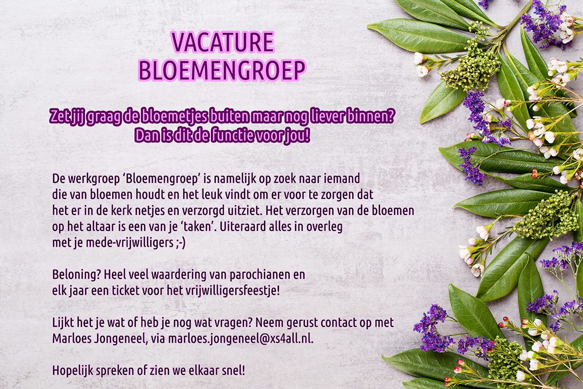 In onze parochiële vacature- bank kwamen we deze vacature van de bloemengroep tegen die we graag onder ieders aandacht willen brengen. Is het iets voor (jo)u, laat het Marloes Jongeneel maar weten. Ook als je iemand kent die er mogelijk geschikt voor kan zijn. Heb jij iets met bloemen / bloemschikken… reageer maar! Ben je met bloemen / bloemschikken in je opleiding bezig… reageer want deze praktische ervaring staat later ook mooi en bloeiend op je cv als je gaat solliciteren. We zijn benieuwd. En nieuwe vacatures in (jo)uw werkgroep kunnen altijd bij Marloes van de pastoraatgroep worden gemeld.