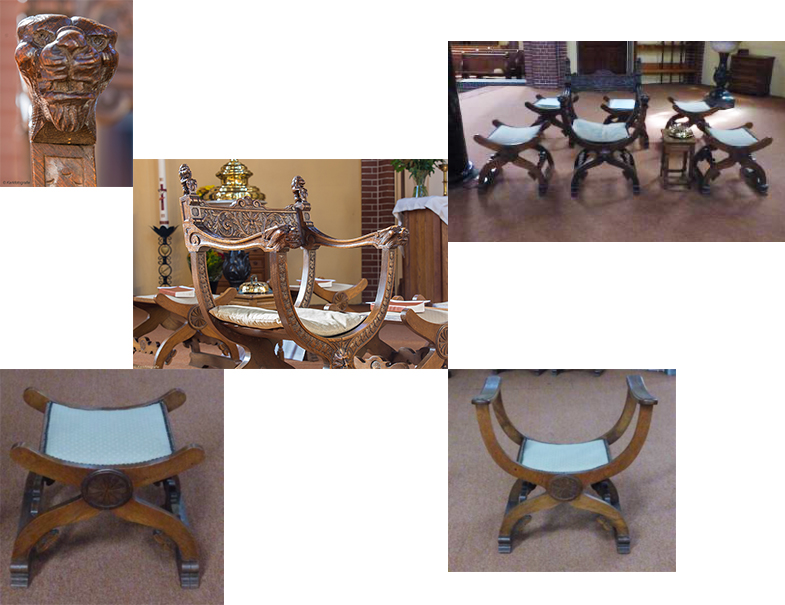 Het gaat om drie sedilia en acht taboeretten op het priesterkoor alle gemaakt van eikenhout, koper en stof voor de bekleding. De sedilia bestaan uit een priesterzetel en twee diakenzetels. Dit unieke ensemble, staat er sinds ongeveer 1930, is uitgevoerd volgens het Dagoberttype (faldistorium) met op de kruising van de stijlen een rond medaillon met rozet. De vernieuwde stoffen bekleding is met koperen nageltjes vastgezet.