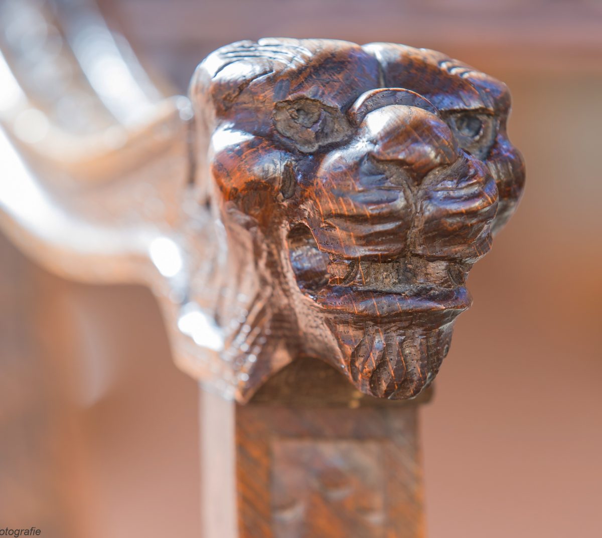 Verder staat er in een renaissance-trant uitgevoerde priesterzetel, uit de jaren 1875 – 1900, eveneens volgens het Dagoberttype maar… deze heeft een rugleuning. Verschil met de diakens en anderen moet er toch wezen! Deze is verlevendigd met gesneden arabesken. Verder heeft deze zetel een masceron, leeuwenkopjes en als schildhouders uitgevoerde staande leeuwtjes.