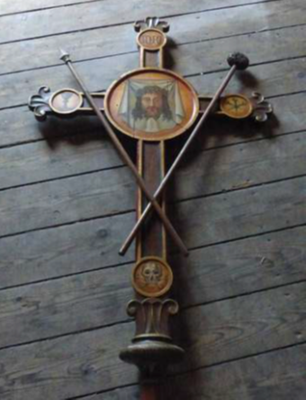 Het gepolychromeerde eikenhouten passiekruis dateert uit de jaren 1900 – 1915. Het bevat diverse lijdenswerktuigen van Christus, die zowel voor als achter op ronde medaillons zijn geschilderd. Kruislings tegen het kruis zien we de lans en de stok met de spons met zure wijn van de Romeinse soldaten. Het passiekruis is gemaakt met diverse kleuren verf en er is ook royaal met goudverf gewerkt. Kijken we naar de afmetingen dan is dit passiekruis een 163 cm hoog, 74 cm breed en heeft de nodus een diameter van 18 cm. Het bevindt zich in een zeer goede staat want er is niet veel mee gesjouwd in de vorige eeuw. De deskundigen van het Museum Catharijneconvent vinden het dan ook erg jammer dat dit religieuze voorwerp ook op zolder ligt. Is er nergens in het kerkgebouw een mooie plek voor dit passiekruis te vinden dan?