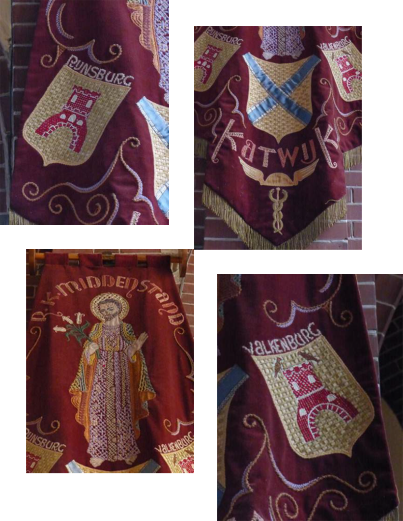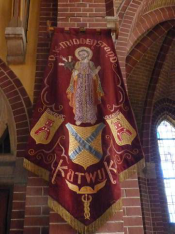 Het schitterende vaandel van de r.-k middenstand is in rood fluweel uitgevoerd waarop borduurwerk. Midden op het vaandel is de H. Jozef afgebeeld staande en met lelietak. Daaronder zijn de wapenschilden van Katwijk, Rijnsburg en Valkenburg zichtbaar. Geheel onderaan zijn attributen van de middenstand zichtbaar en wel de caduceus en gevleugelde helm van de goden Hermes (Grieks) of Mercurius (Romeins). Deze goden hadden als ‘portefeuille’ handel, verkeer en boodschappers. Dat is een staf met twee slangen eromheen en twee vleugels bovenop en gebruikt als herautenstaf om onbelemmerde doorgang te garanderen. De Koninklijke Nederlandse Munt gebruikt het ook al jaren als muntteken. Geheel bovenaan het vaandel staat ‘R.K. MIDDENSTAND’. Onderaan de achterzijde staat de signatuur ‘Fa. P.P. Rietfort / Haarlem’ en dat is de maker van dit vaandel. Het wordt gedateerd op de jaren 1945 – 1950 en kijken we naar de afmetingen van dit vaandel dan is het 167 cm hoog en een 72 cm breed. Het bevindt zich in een goede staat. Want het zal hoogstens zijn meegedragen door de straten waarna het een vaste plek aan de kerkmuur heeft gekregen.