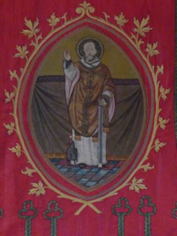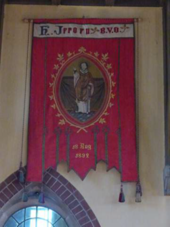 Het roodzijden processievaandel met de afbeelding van de H. Jeroen van Noordwijk hangt rechts van de entree van ons kerkgebouw. Bovenaan het vaandel staat de tekst ‘H. Jeroen B.V.O.’ en onderaan is de tekst ’18 Aug / 1892’ te lezen. Dat jaartal geeft ook het jaar aan dat het vaandel is vervaardigd. Het materiaal dat is gebruikt was zijde (materiaal) en borduurgaren. Kijken we naar de afmetingen dan was het ook een vaandel dat goed zichtbaar was als het door de straten werd gedragen. Het was namelijk 250 cm hoog en ongeveer 90 cm breed. Het bevindt zich, gelukkig, in een goede staat en dat is ons voor te stellen als het vooral aan onze kerkmuur hangt.