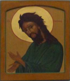Het icoon, een op hout geschilder afbeelding van Johannes de Doper, staat ook in de vergaderzaal van de pastorie. Bij de verf is zeker ook goudverf toegepast voor dit icoon dat is geschilderd in de jaren 2000 – 2010. De afmetingen ervan zijn een 31 cm hoog, een 23 cm breed en een diepte (dikte) qua hout van 2 cm. Het bevindt zich, zeker gezien de ‘leeftijd’ in een goede staat. Maar dat komt natuurlijk ook omdat deze in die vergaderzaal staat en er verder niet mee wordt rondgelopen. De herkomst is een apart verhaal want de parochiekern heeft het verkregen van pater Marcel Taverne bij diens emeritaat. Taverne ging namelijk vol verve voor bij vieringen in onze parochiekern.